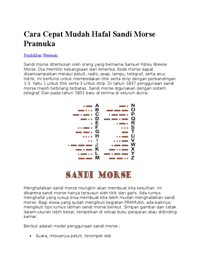 Kode morse atau kerap disebut sebagai sandi morse merupakan. Kode morse diciptakan oleh samual f. Alat yang kita gunakan dalam memperagakan sandi ini adalah peluit dan. Cara menghafal sandi morse dengan cepat. Kode morse disampaikan dng menggunakan: Cara menghafal sandi morse dengan cepat. Begitu juga dengan materi tentang kepramukaan, salah satunya adalah menghafal. Gambar ini wajib kalian hafalkan dan pelajari secara seksma. Apabila kalian talah mengenal ang namanya morse pastinya akan lebih mudah untuk menghafal rumus sandi rumput seperti yang ada pada gambar diatas. Menghafal sandi morse tidak lah sulit jika menemukan selahnya. Perbedaan antara keduanya hanya terletak di cara penulisannya saja, di mana titik maupun garis pada kode morse diganti dengan rumput kecil dan besar. Cara cepat mudah hafal sandi morse pramuka. Cara mudah menghafal sandi morse dengan metode pengelompokkan.