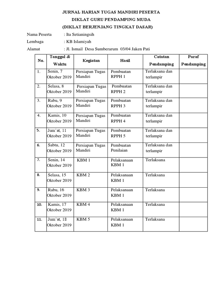 Contoh format kegiatan shalat berjama mingguan. Contoh pengisian jurnal harian kepala sekolah jurnal doc. Pada postingan kali ini kami akan berbagi jurnal harian daring kelas 3 semester 1 revisi 2020. Contoh penilaian harian paud (pendidikan anak usia dini). Update 2018 contoh jurnal harian guru tk paud berikutnya kami akan kembali menyajikan sebuah format jurnal guru untuk agenda harian mengajar di kelas dimana contoh jurnal untuk guru tk paud yang akan admin bagikan inipun dapat melengkapi kelengkapan administrasi disekolah terutama untuk. Contoh laporan mingguan proyek kontraktor. Update 2018 contoh jurnal harian guru tk paud berikutnya kami akan kembali menyajikan sebuah format jurnal guru untuk agenda harian mengajar di kelas dimana contoh. Contoh pengisian jurnal harian kepala sekolah jurnal doc. Untuk memudahkan bapak ibu staf tata usaha tu dalam membuat admnistrasi sekolah memalui postingan ini blog guru madrasah akan. Format jadwal diatas, secara langsung bisa kita gunakan untuk pengisian butir 6.3.3 upload jadwal harian dan butir 6.3.4 upload jadwal mingguan. Beragam teknik evaluasi dan penilaian paud dapat dilakukan guna mengumpulkan informasi tentang perkembangan dan pertumbuhan anak usia dini di sekolah paud. Update 2018 contoh jurnal harian guru tk paud berikutnya kami akan kembali menyajikan sebuah format jurnal guru untuk agenda harian mengajar di kelas dimana contoh jurnal untuk guru tk paud yang akan admin bagikan inipun dapat melengkapi kelengkapan administrasi disekolah terutama untuk. Format laporan kegiatan magang cute766.