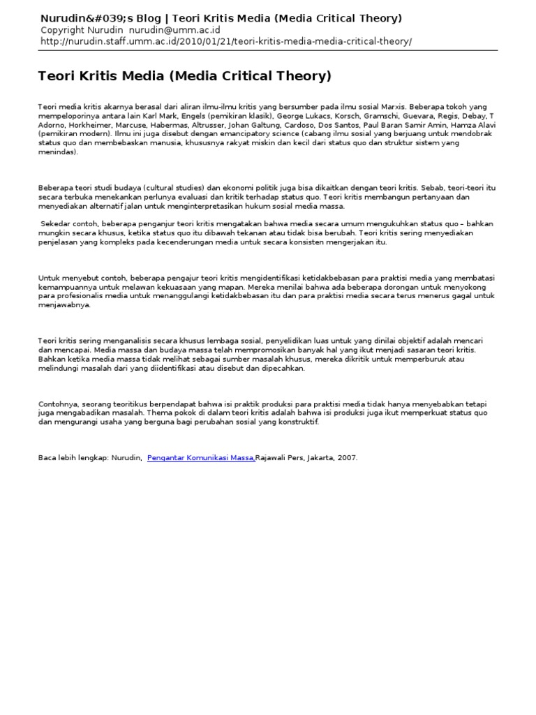 Teori kritis memungkinkan kita membaca produksi budaya dan komunikasi dalam perspektif yang luas dan beragam. Ini berarti bahwa pada situasi tertentu komunikasi massa dapat mempunyai pengaruh yang penting kedua, pengaruh efek terbatas hanya melihat efek The focus of this research is the fulfillment of emotional needs of. Tentang hal ini horkheimer menyatakan bahwa semua pemikiran, benar atau salah, tergantung pada keadaan yang berubah sama sekali tidak berpengaruh pada validitas sains. Tidak semua ilmuwan yang mendalami komunikasi massa itu menggunakan pendekatan ilmiah ( scientific approach).