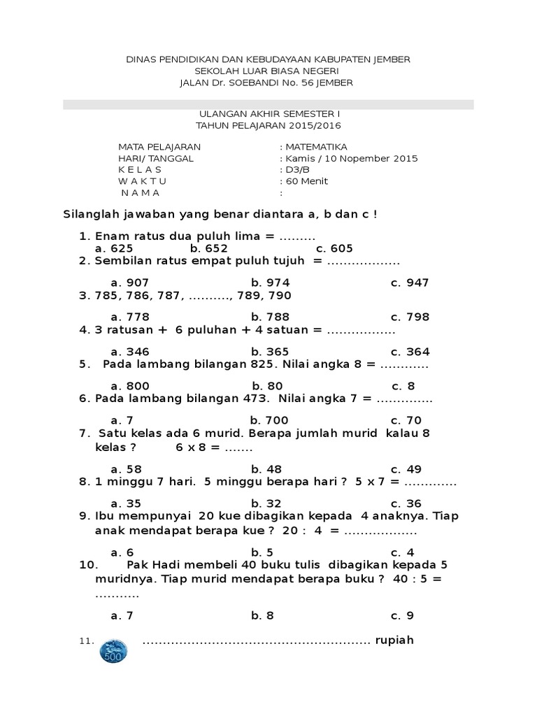 Contoh soal ujian sdlb kelas 1 ilmu pengetahuan 8. Contoh soal usbn smplb tunarungu. Soal bahasa indonesia sdlb tunarungu. Contoh soal slb tunagrahita atau slb c. Jangan khawatir sekolahdasarnet akan memberikan kumpulan soal uas matematika untuk kelas 1 sampai kelas 6 sd semester 1.