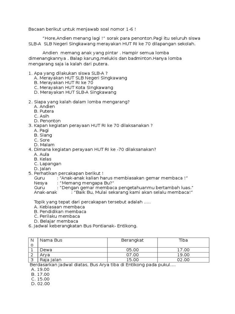 Soal Bahasa Indonesia Sdlb Tunarungu from imgv2-2-f.scribdassets.com Berikut ini adalah contoh soal uas kelas 6 semester 2 dan kunci jawabannya yang bisa digunakan untuk melengkapi administarsi guru yang dapat di unduh secara gratis dengan menekan tombol download. Soal bahasa indonesia sdlb tunarungu doc document. Soal agama sdlb tunarungu kelas 2. Kisi kisi soal usbn pendidikan smplb tunarungu kurikulum 2013 tahun 2019 kisi kisi un usbn. Soal bahasa indonesia sdlb tunarungu. Jangan khawatir sekolahdasarnet akan memberikan kumpulan soal uas matematika untuk kelas 1 sampai kelas 6 sd semester 1. Adapun kelas atau sekolah di slb biasanya terbagi menjadi slb a (tuna netra) slb b (bisu tuli) slb c (tuna grahita) dan slb d (tuna daksa), dan kalau tidak salah dengar kakak pernah tahu ada slb e mungkin untuk bagian tuna laras atau anak. Soal tes bahasa inggris kls 1.
