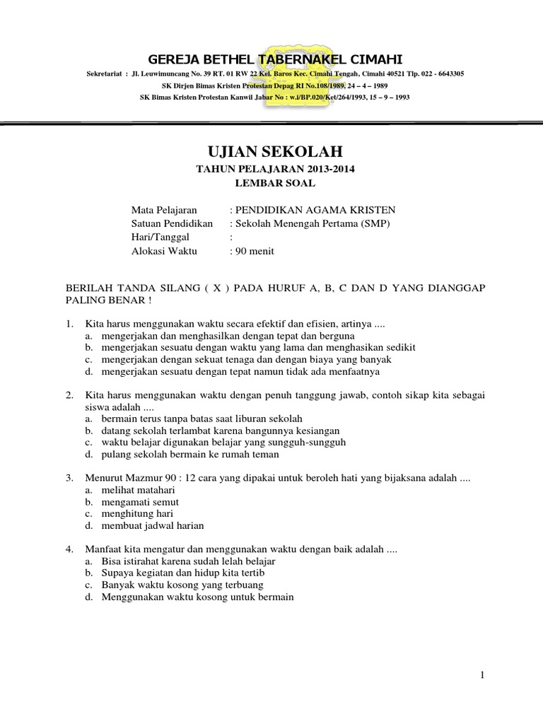 Soal dan jawaban agama kristen kelas 11 semester 1. Untuk smp kelas vii isbn 978 602 1530 42 9 jilid lengkap isbn 978 602 1530 43 6 jilid 1 1. Soal pts agama kristen smp kelas 7 semester 2 kurikulum 2013 adalah artikel yang akan kami bagikan pada kesempatan kali ini. Silabus agama kristen sd kelas 4 semester 1. Agama & budi pekerti sman 1 semarang. Soal uas agama kristen kelas 6 dan kunci jawaban. Download rpp agama katolik kurikulum 2013 sd. Soal dan kunci jawaban agama. Kunci jawaban soal pendidikan agama kristen kelas 1 ulangan tengah semester ii tahun pelajaran i. Demi menunjang kebutuhan soal uas pada artikel kali ini admin akan membagikan soal uas agama kristen kelas 11 semester 1 k13 2020 dan kunci jawaban lengkap dalam bentuk online dan pdf yang bisa di download secara gratis. Kita harus menggunakan waktu dengan penuh tanggung jawab, contoh sikap kita sebagai siswa adalah. Kali ini admin akan membagikan contoh soal soal latihan ulangan ukk agama islam pai yang terbaru 2018 untuk kelas 1 sekolah dasar sd yang disertai dengan kunci jawaban. Dinas pendidikan kabupaten pati kecamatan gunungwungkal ulangan akhir semester uas ii sekolah dasar tahun pelajaran 2014 2015 mata pelajaran.